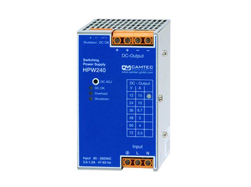 HPW02401 Series TS35mm DIN-Rail mounting, 240 Watts, single 12V-72V DC output, with wide adjustment range. The HPW models are industrial high-performance power supplies „Made in Ge...