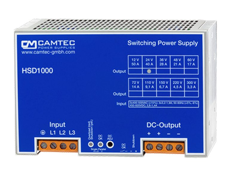 HSD10001 Series DIN rail mounting, 2 & 3 phase AC input, 1000 Watts, single 12V, 24V, 36V, 48V, 60V or 72V DC output. The HSD 3-phase models are industrial high-performance pow...