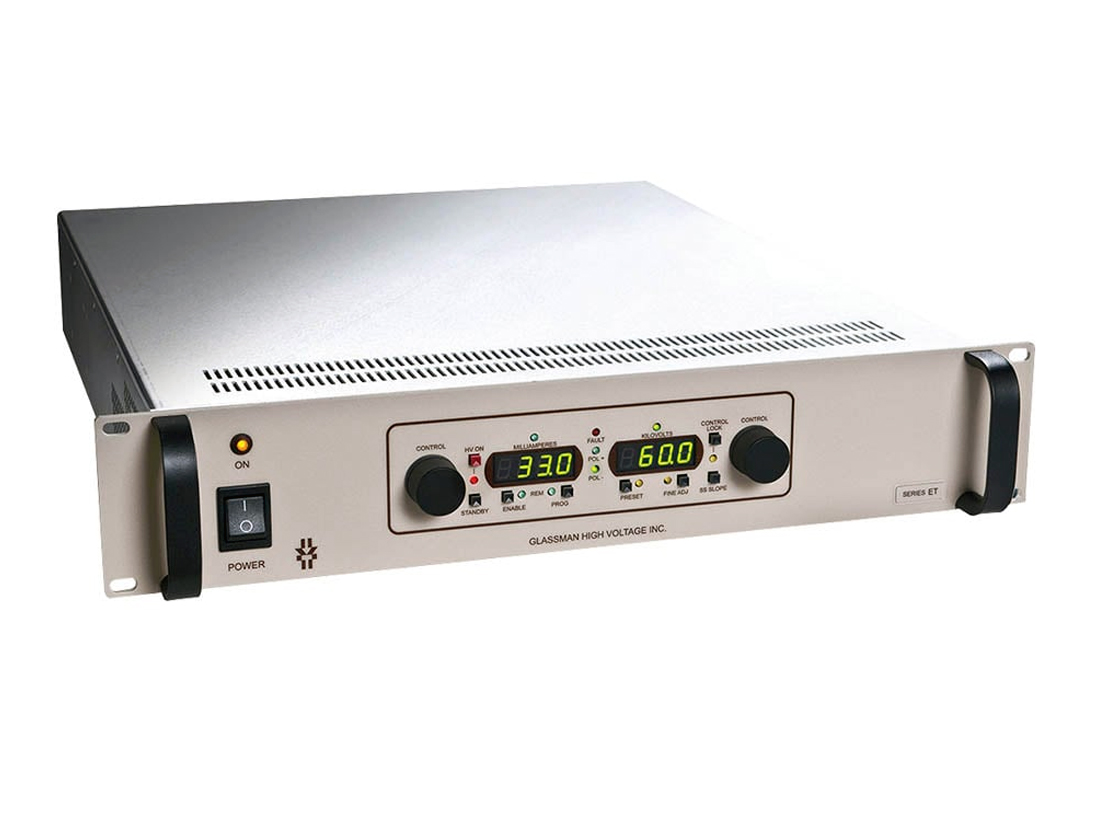 The ET Series of 2000 watt high voltage supplies feature flexible embedded controls with low ripple and noise. They are air insulated, fast response units, with tight regulation and extremely low arc discharge currents.