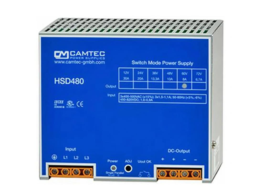 DIN rail mounting, 3 phase AC input, 480 Watts, single 24V-72V DC output.