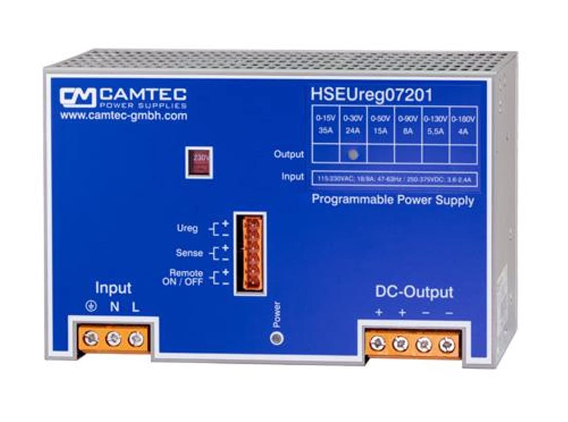 DIN rail mounting, 720 Watts, 6 models single outputs 15V,30V,50V, 90V, 130V and 180V DC output, voltage programmable 0-100%.