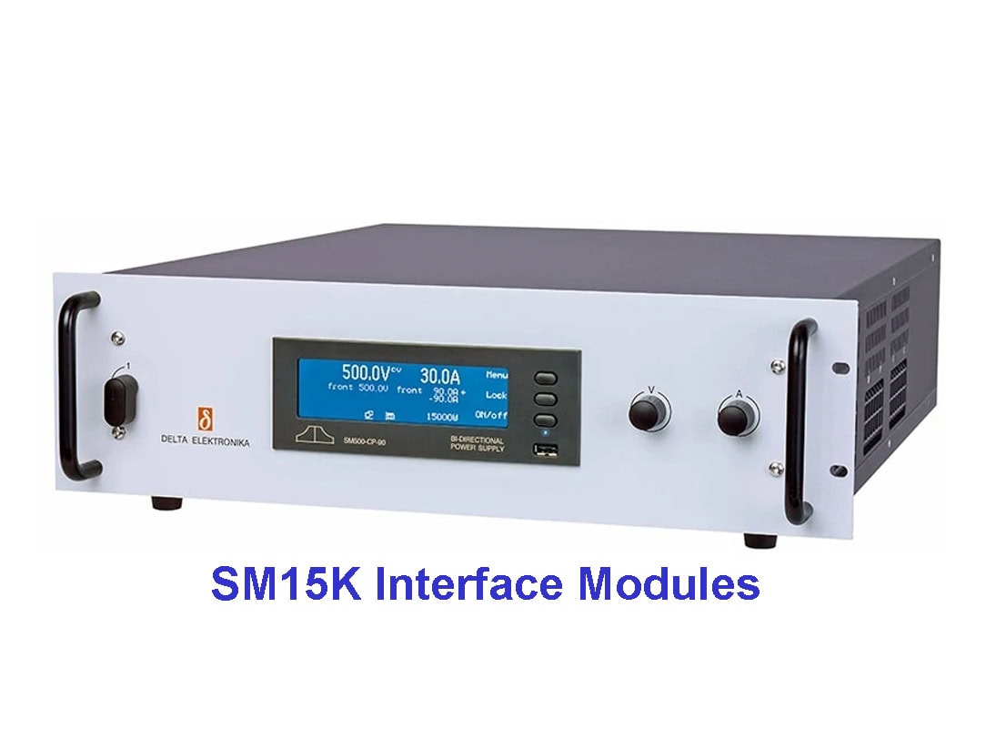 Six plug and play interface modules are available for the SM15K series. Multiple interfaces are possible per power supply. They are isolated from the output voltage with working voltage of 1000V or 1500V depending on type of unit. Floating with respect to earth.